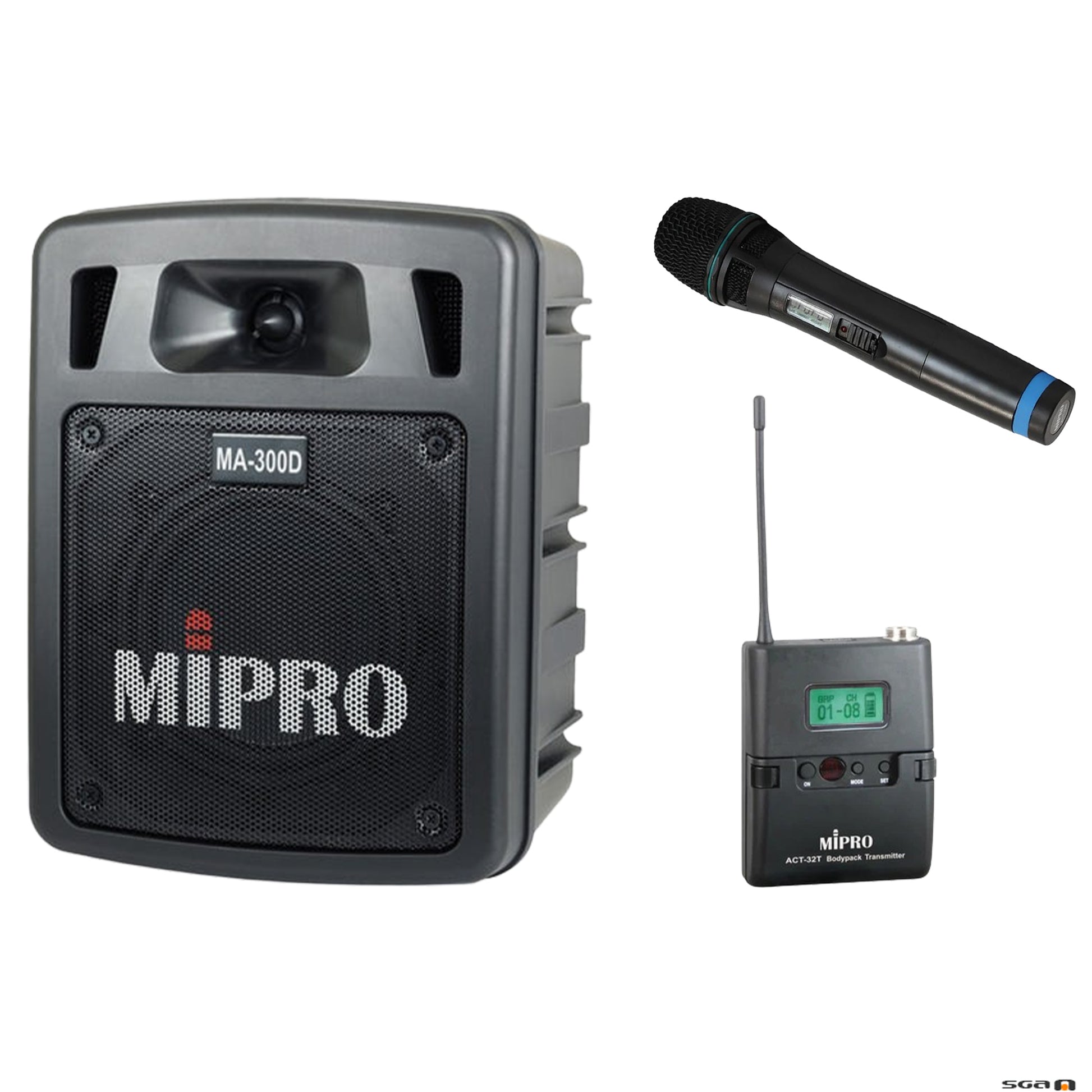 Package Includes: The price listed here is for the Mipro MA300D PA with dual receiver and 1 x ACT32H-5 Wireless Handheld microphone and 1 x ACT32T-5 Beltpack Transmitter.