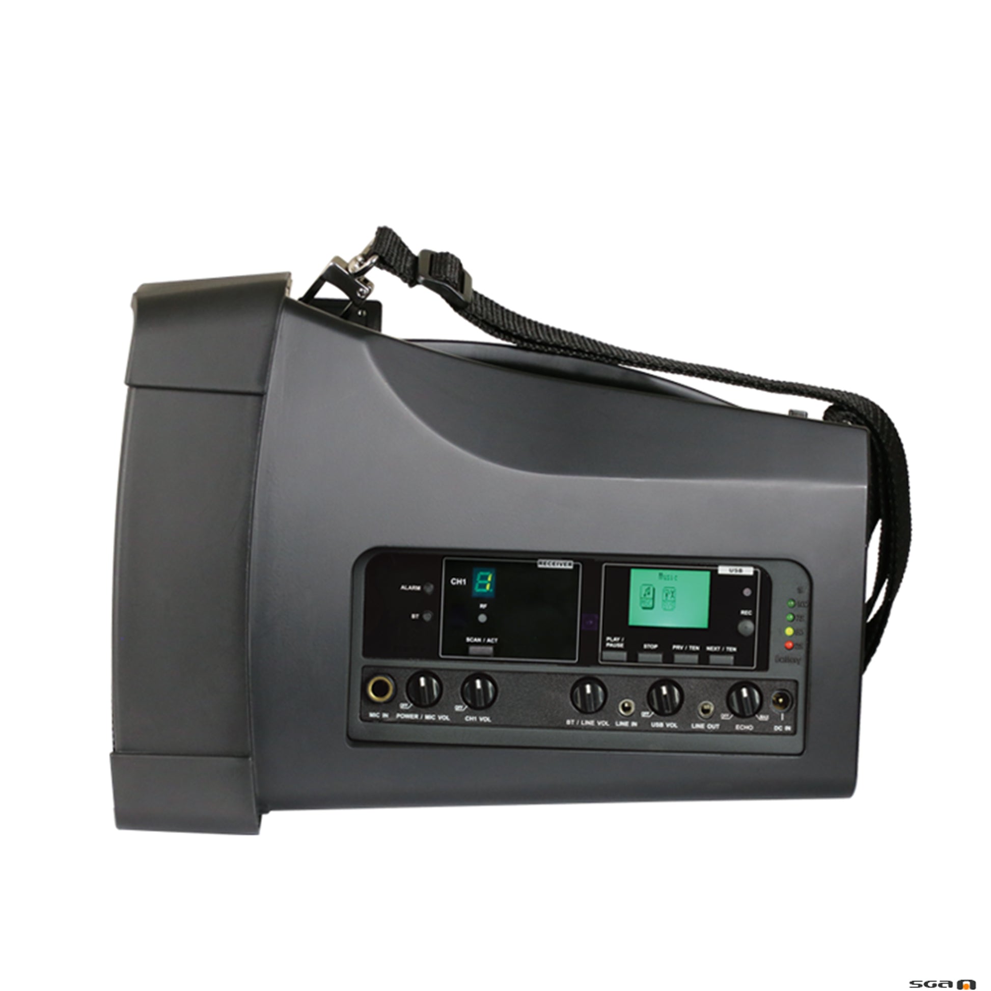 - Plug-in Bluetooth module, USB player/recorder, built-in echo function, and alarm siren which has a fade-in effect.